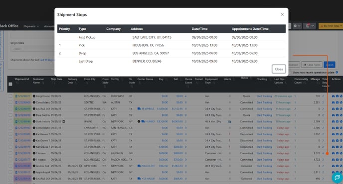 View stop details, including pickup/delivery dates and appointments, right from the stop count column. This gives your team instant scheduling visibility without needing to open each shipment.
