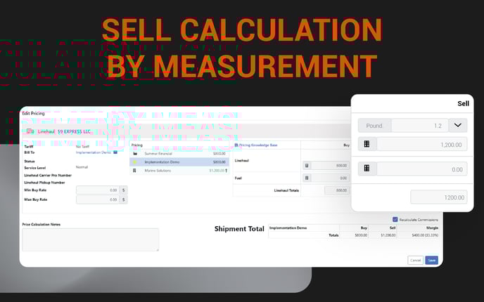 Calculate sell values using cost-per-measurement (weight, pieces, or miles). This makes pricing more flexible and ensures quotes match the way your customers expect to be billed.