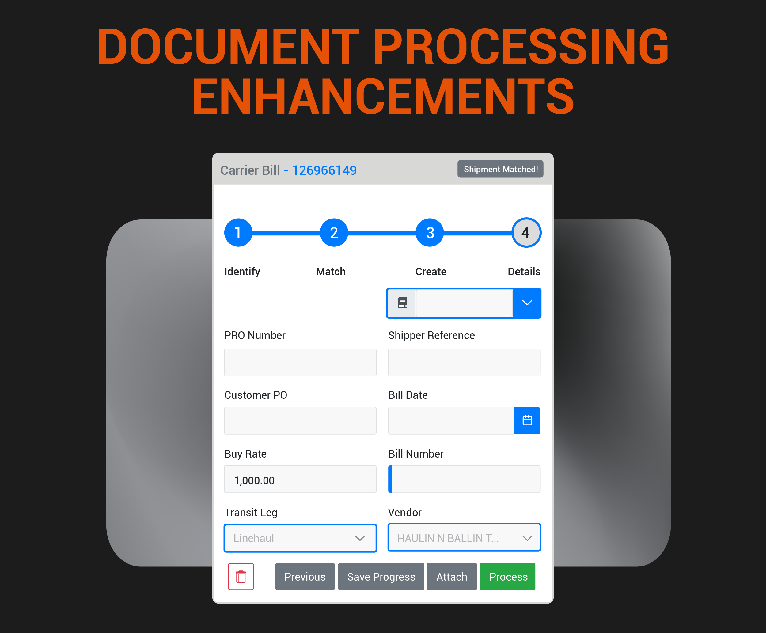 Keep work moving even when a shipment doesn’t exist yet. If a document arrives without a matching shipment, you can now create one directly from the Document Processor using the same workflow as standard shipment creation, including support for incomplete shipments so details can be finalized later.