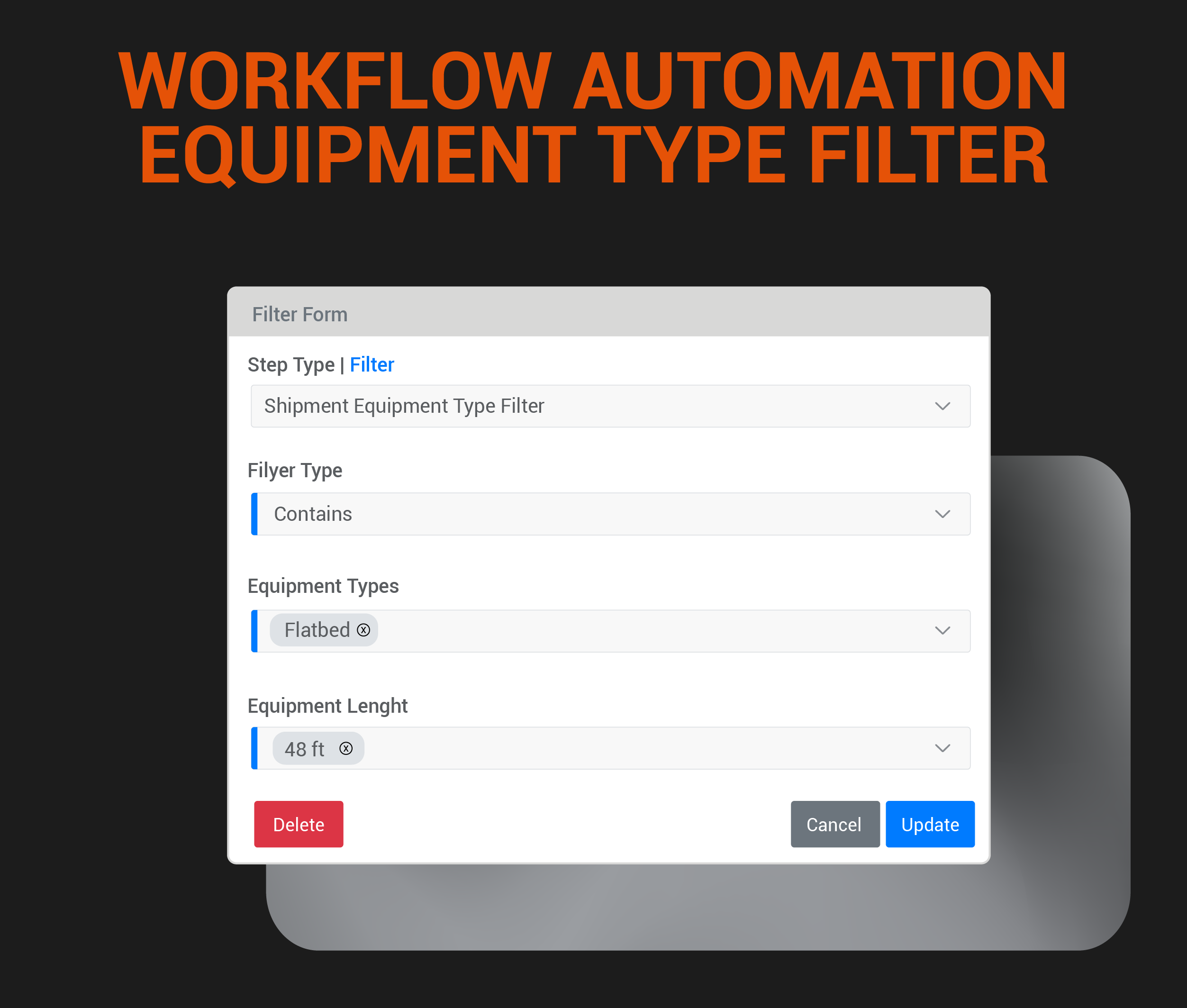 Trigger workflows based on the equipment required for a shipment. The Equipment Type Filter enables automations to run when a specific equipment type—such as reefer, flatbed, or dry van is selected, ensuring alerts, actions, and escalations align with the freight being moved.