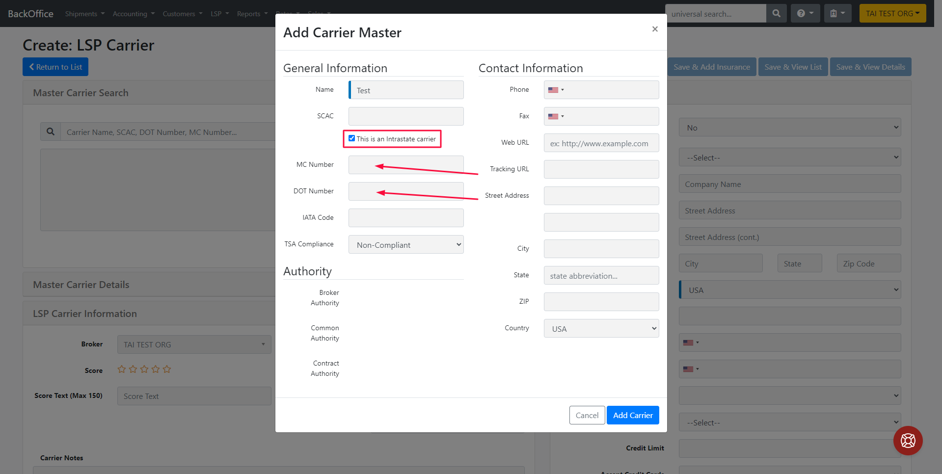 If the carrier is intrastate, check the box “This is an intrastate carrier” to make the MC and DOT fields optional.