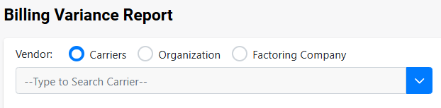 All Vendors. (Includes vendor results with billing variances (carriers, organizations, or factoring companies), regardless of previous selections.)