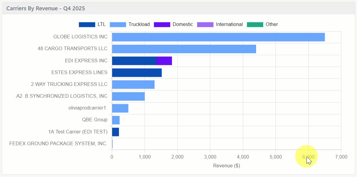 The Carrier Summary page provides a high-level view of carrier performance and financial metrics. It helps teams evaluate carrier reliability, volume distribution, revenue, and profitability to support operational decisions and carrier management.