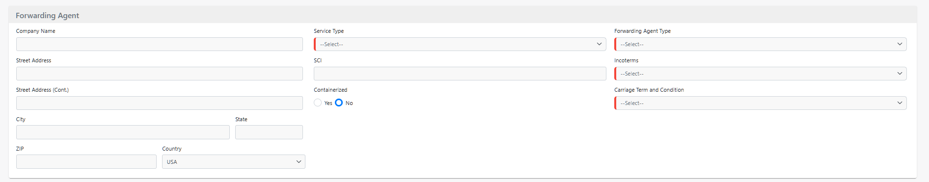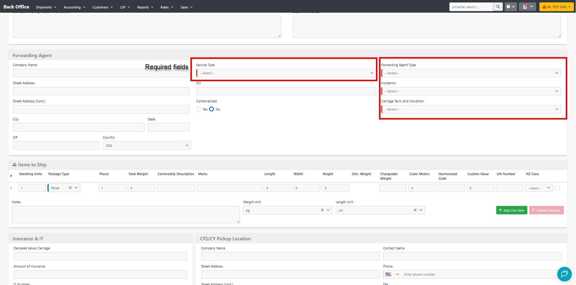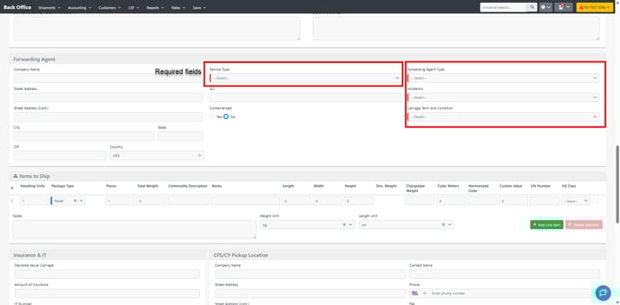 - Fill in all the key details on the Shipment Page. Required fields are indicated by a blue line to the left of the field name.