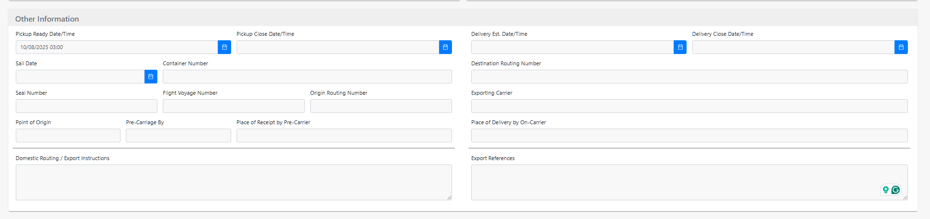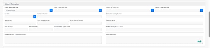 Other Information: This section should include every required reference number field for International. Ocean shipment.