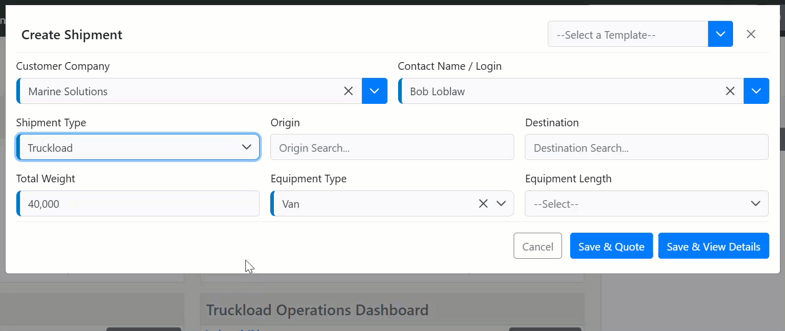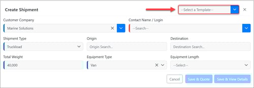 If your customer has saved shipment templates, a Template search field appears at the top of the modal. Type to search by template name and select one to auto-populate specific fields.