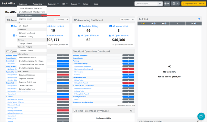 The Create Shipment modal allows you to quickly create a new shipment in the Back Office from any page.