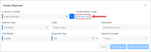 - If the selected staff member has a default shipment type configured, the Shipment Type field updates automatically upon selection.