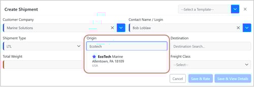 | Save & Rate | LTL only | Creates the shipment and opens the Rating page. Only enabled when Origin, Destination, Handling Units, and Freight Class are all filled in |