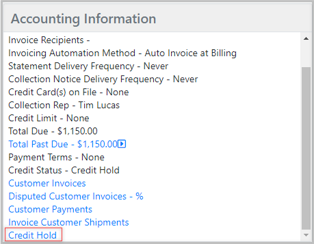 - The Credit Hold page can be accessed by clicking on the Credit Hold link in the Accounting Information section: