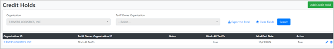 - If a Credit Hold is resolved from the Accounting Profile, the "Block All Tariffs" entry on the Credit Hold page is automatically removed.