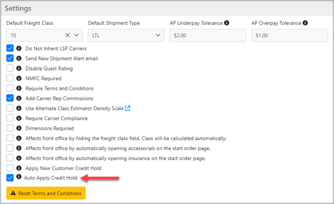 The Auto Apply Credit Hold feature can be enabled from the LSP Org Settings page. When enabled, the system will auto-apply the credit hold status to the customer's accounting profile whenever the Credit Limit goes from acceptable to exceeded.