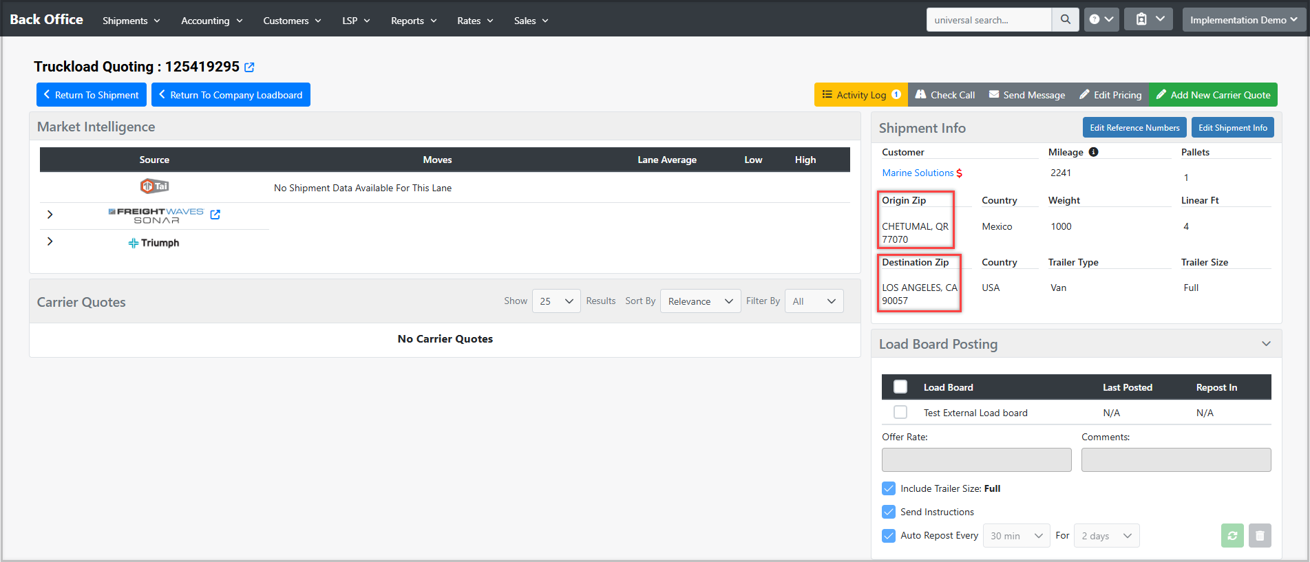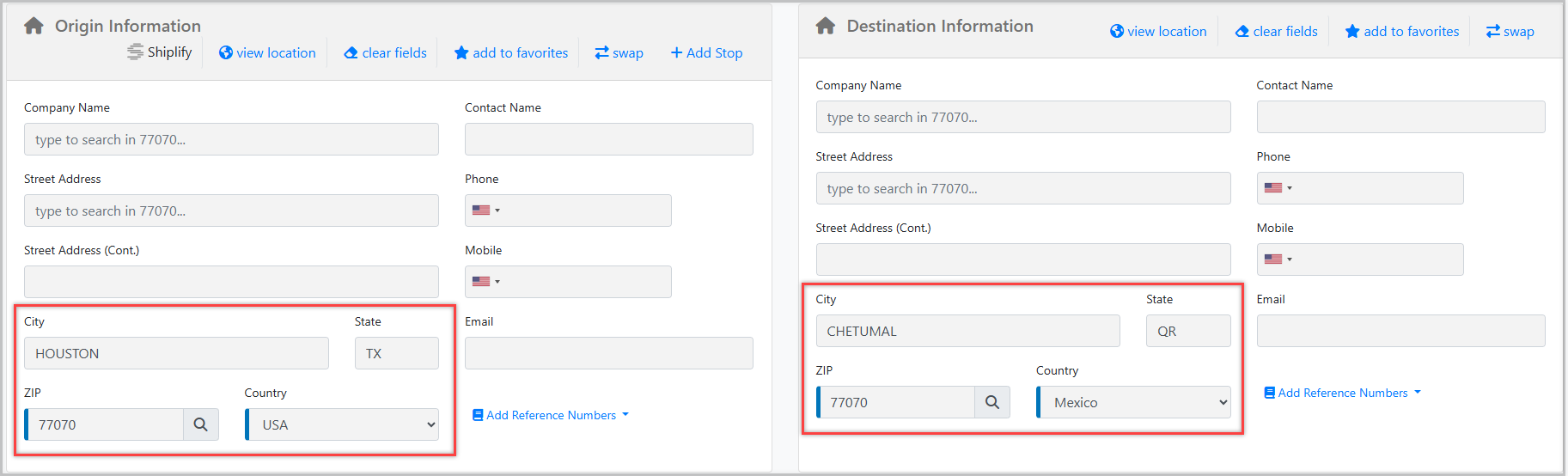 The TMS supports creating and managing cross-border shipments between the United States, Canada, and Mexico for both Truckload and LTL modes.