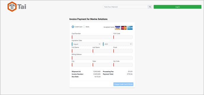 The Click to Pay feature allows invoice recipients to complete a credit card payment without logging into the TMS. This is handled through a secure, one-time-use payment link that directs users to a streamlined, unauthenticated payment page.