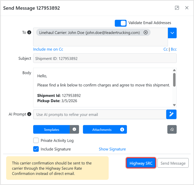 Any carrier confirmation attached to the Send Message modal can be delivered through the Highway SRC workflow.
