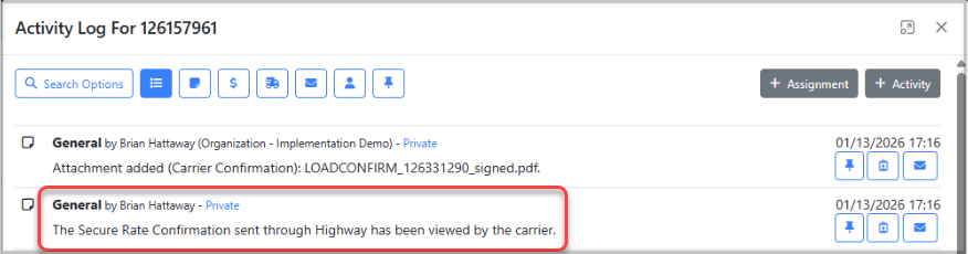 Activity Log: “The Secure Rate Confirmation sent through Highway has been viewed by the carrier.”