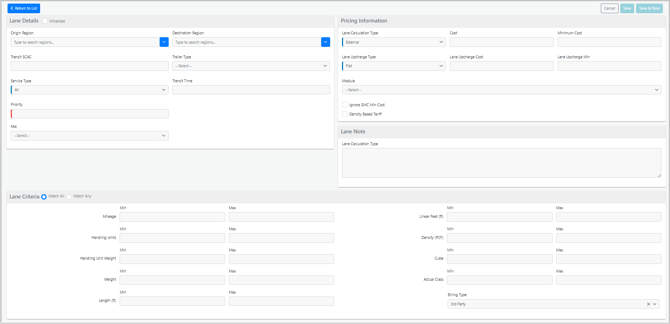- Lane Criteria: The user can select and specify the criteria needed for the lane to provide a rate, including mileage, weight, class, and so on.