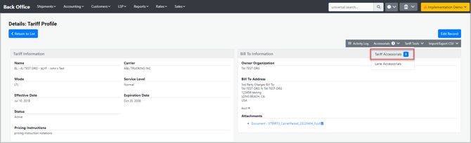 Specifically, for manual tariffs and to have them rate a shipment with accessorials, the user may need to first add the accessorial to the tariff with the corresponding rate. Otherwise, the tariff may error when trying the rate shipment. To do this, go to the tariff profile and click Accessorials > Tariff Accessorials. Once there, click Add New Accessorial Tariff.