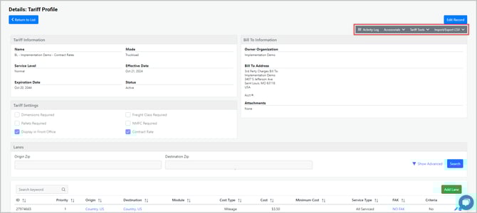 After creating the tariff, a tariff profile will be generated by the system, including the selected lanes from the previous section. At the top of the profile, users will find the following features: