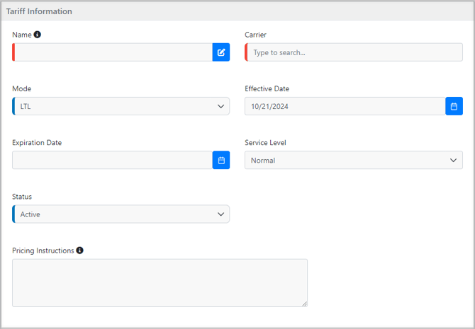 - Name: Even though the name will be built automatically, enter a preliminary name to save the tariff. If the tariff is blanket for all customers, the name will start with a "BL," and if the tariff is customer-specific, it will start with a "CS." The name of the customer or the organization will follow, as will the carrier's SCAC.