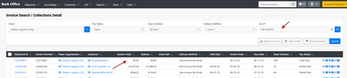 The Collections Summary surfaces invoices based on open/paid status and the “as of” date.