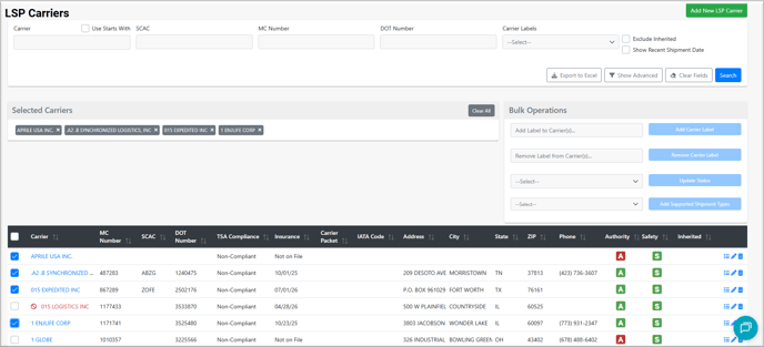 The LSP Carrier Search Page allows you to perform bulk actions on multiple carriers simultaneously. This helps streamline carrier management by applying changes across selected carriers with a single action.