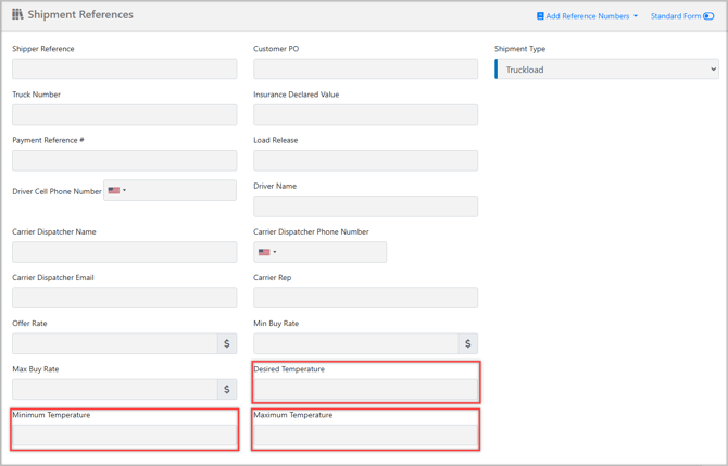 These reference numbers can also be specified when selecting the trailer type for the shipment. If a reefer trailer is chosen, the system will prompt you to input the desired temperature parameters with a modal.