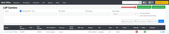 You can onboard a carrier directly from the LSP Carrier List or Truckload Quoating by emailing a packet invitation.