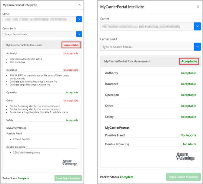 Prior to sending the packet invitation, the system will present the MyCarrierPortal Risk Assessment status, which includes details on Authority, Insurance, Operations, Safety, MyCarrierProtect, and other relevant information. The status will be categorized as either Acceptable or Unacceptable. If the status is Unacceptable, specific reasons will be provided under the corresponding categories.