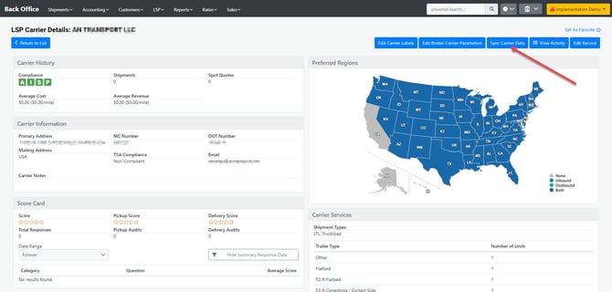 Users can initiate a carrier data sync by clicking the "Sync Carrier Data" button. This option is accessible within the LSP carrier's profile, which can be found by navigating to LSP > LSP Carriers and selecting the specific carriers whose data you wish to sync.