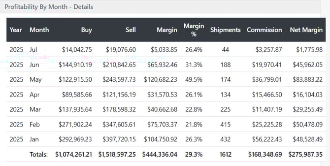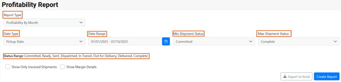 By default, the report displays data from the Profitability by Month view, this is filtered based on the Pickup Date. It covers the period from the first day of the current year up to the date the report is generated. The report includes shipments with statuses ranging from Quote to Complete.