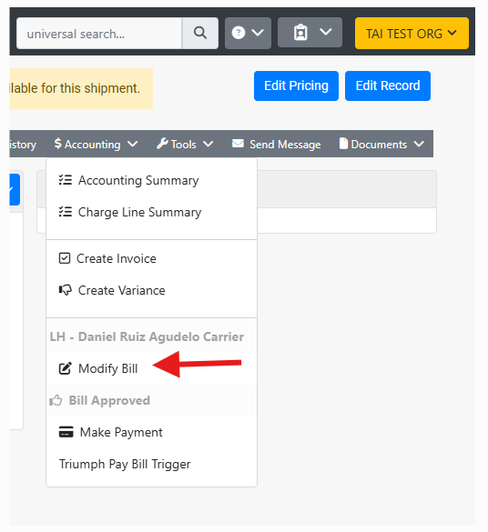 - Any Accessorial that already exists on a bill will not display as a selectable option