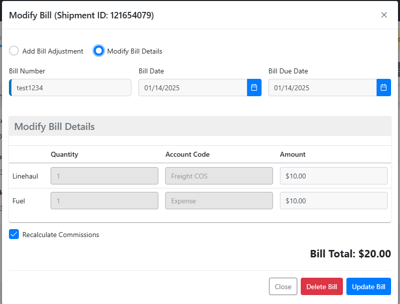 - You can set whether you want to Recalculate Commissions based on this bill change.