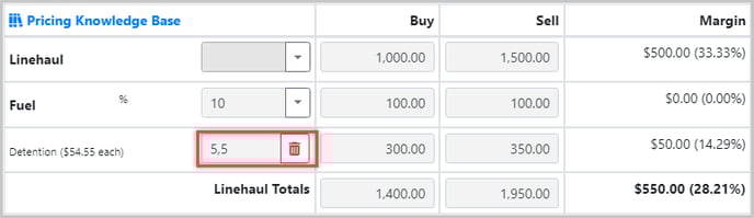 When the accessorial quantity is modified, the buy rate automatically adjusts to reflect the change in the total cost.