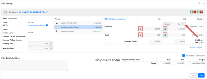 - The Linehaul Sell Amount is recalculated based on the Fuel Percentage.
