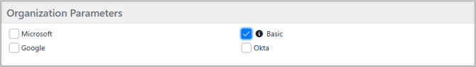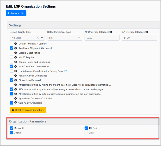 To manage your SSO settings, navigate to the LSP tab and select 'My Organization,' then proceed to 'Organization Settings.' Within the Organization Parameters section, you will find checkboxes for Google, Microsoft, Basic Login, and Okta. By unchecking any of these options, you can customize the login page to display only the needed authentication methods.