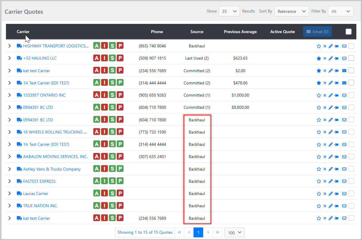 With the Backhaul Filter, that carrier will automatically appear in your Truckload Quoting results, making it easy to contact them for a return load or next pickup.