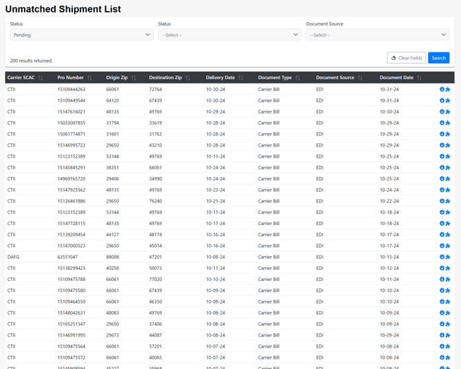 - Give operations and accounting teams a single queue to review, match, or discard documents that arrive from EDI, OCR, or integration partners without a valid shipment identifier.