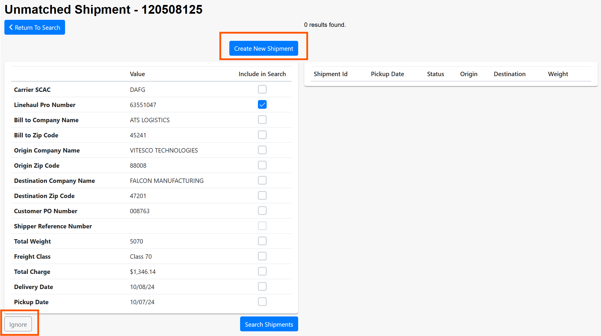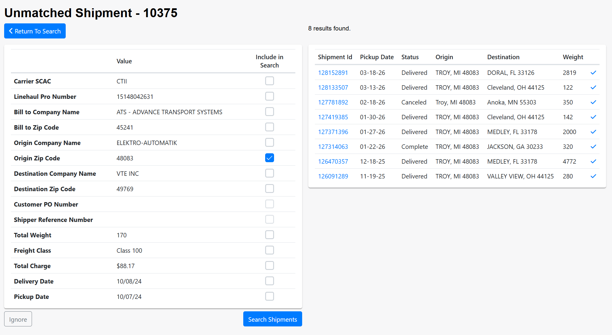 - Match to Existing Shipment. Open the record and search the TMS for a matching shipment using any combination of Bill-To company, Bill-To ZIP, carrier SCAC, origin ZIP, origin company, destination ZIP, destination company, weight, customer PO, shipper reference, linehaul Pro number, freight class, total charge, pickup date, or delivery date. The search returns up to 20 candidate shipments ordered by most recently created. Select the correct shipment and confirm the match. The system immediately attempts to auto-approve the carrier bill on that shipment and writes a note to its activity log.