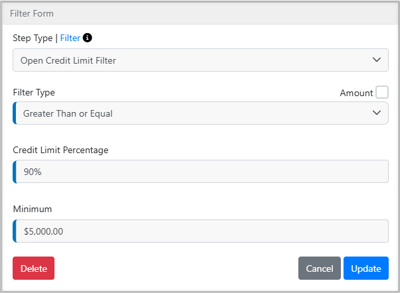 - Open Credit Limit Filter: This filter enables you to monitor the customer's credit limit, prompting the system to take action when the limit reaches a predetermined percentage or specific amount.