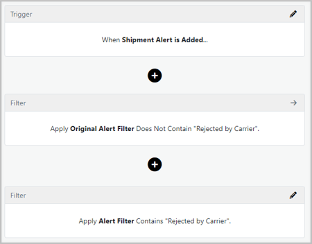 - The filter type "Does not Contain" in the Original Alert Filter indicates that the shipment previously did not contain the alert "Rejected by Carrier."