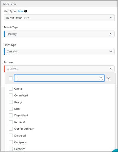 - Transit Status Filter: The Transit Status Filter enables Workflow Automations to trigger based on specific transit statuses, rather than just the overall shipment status.